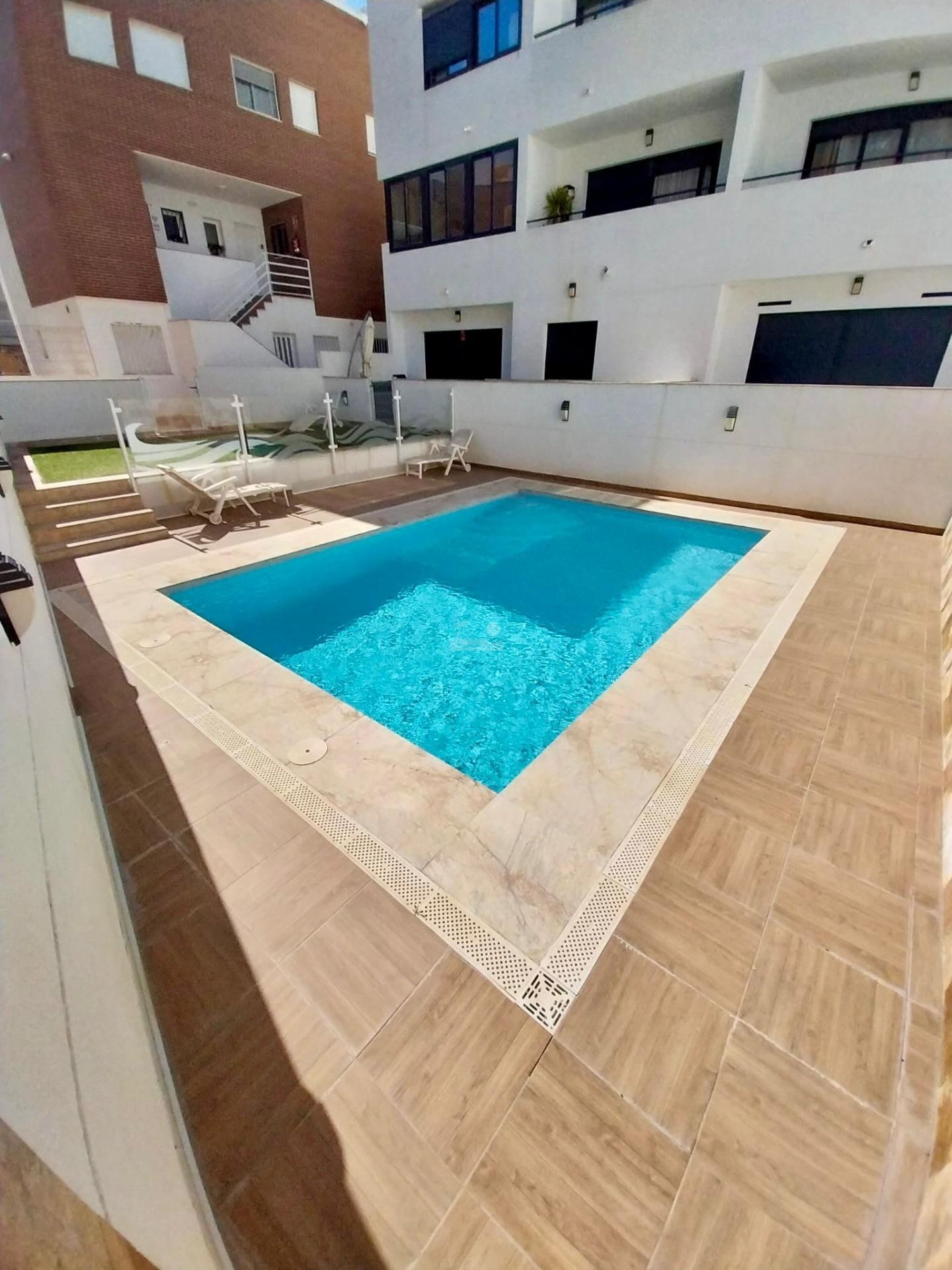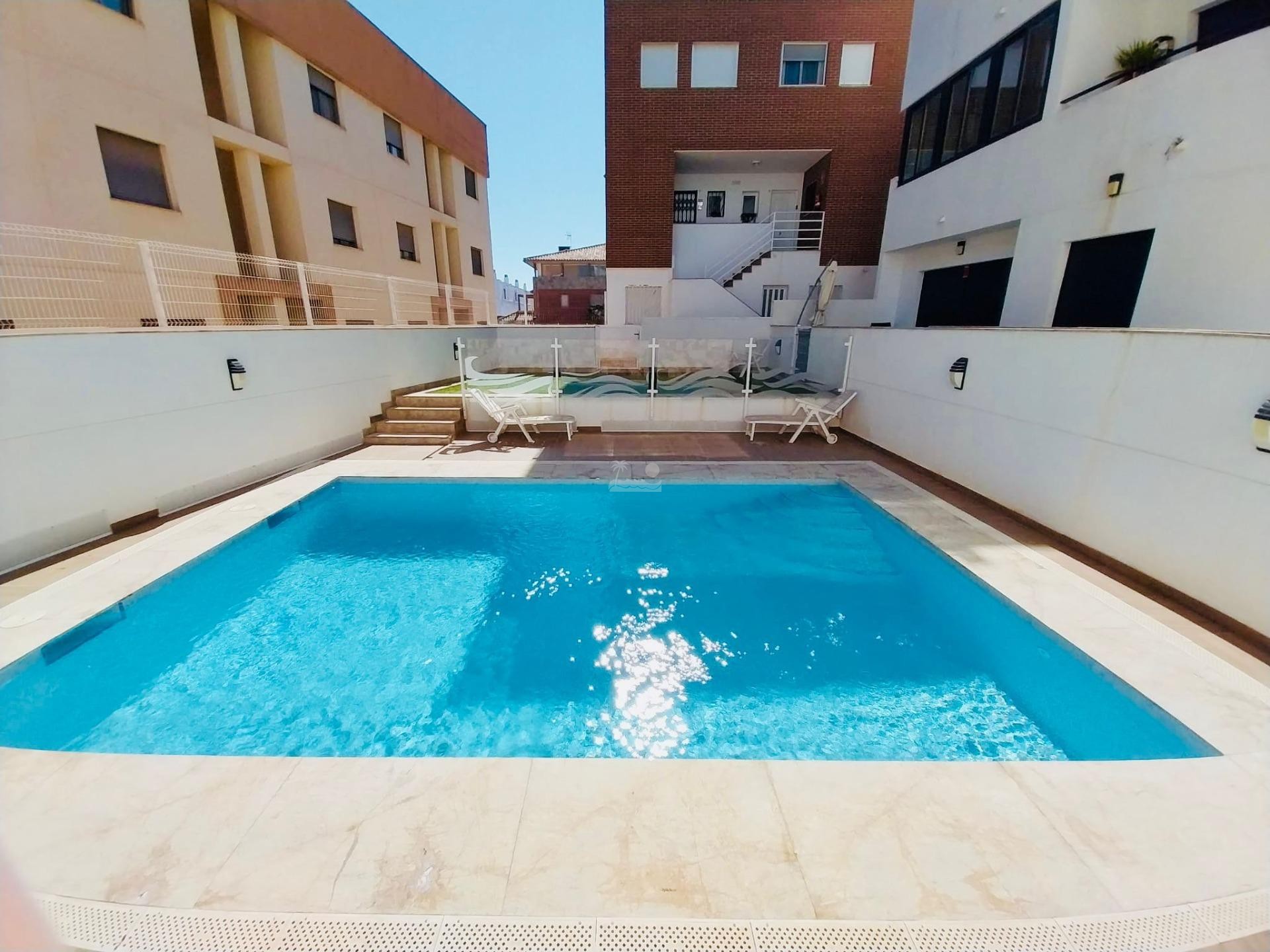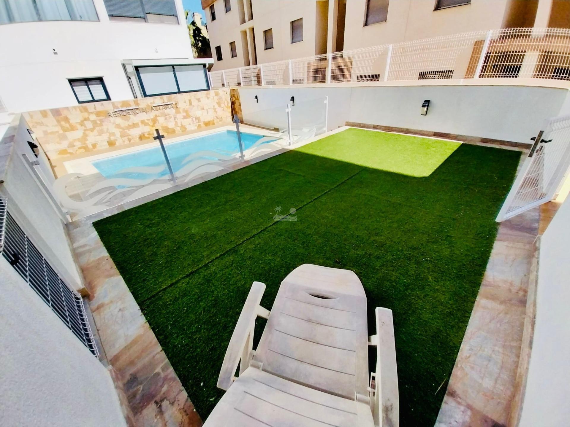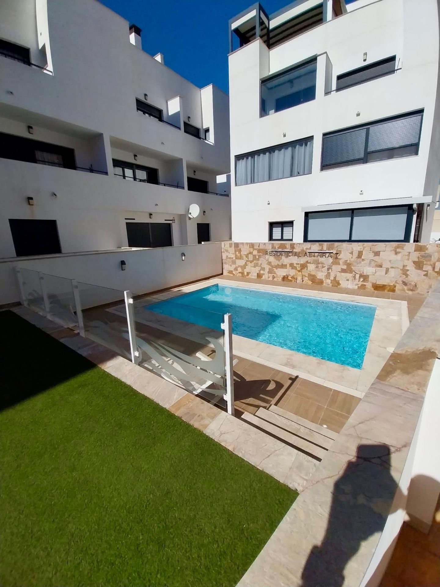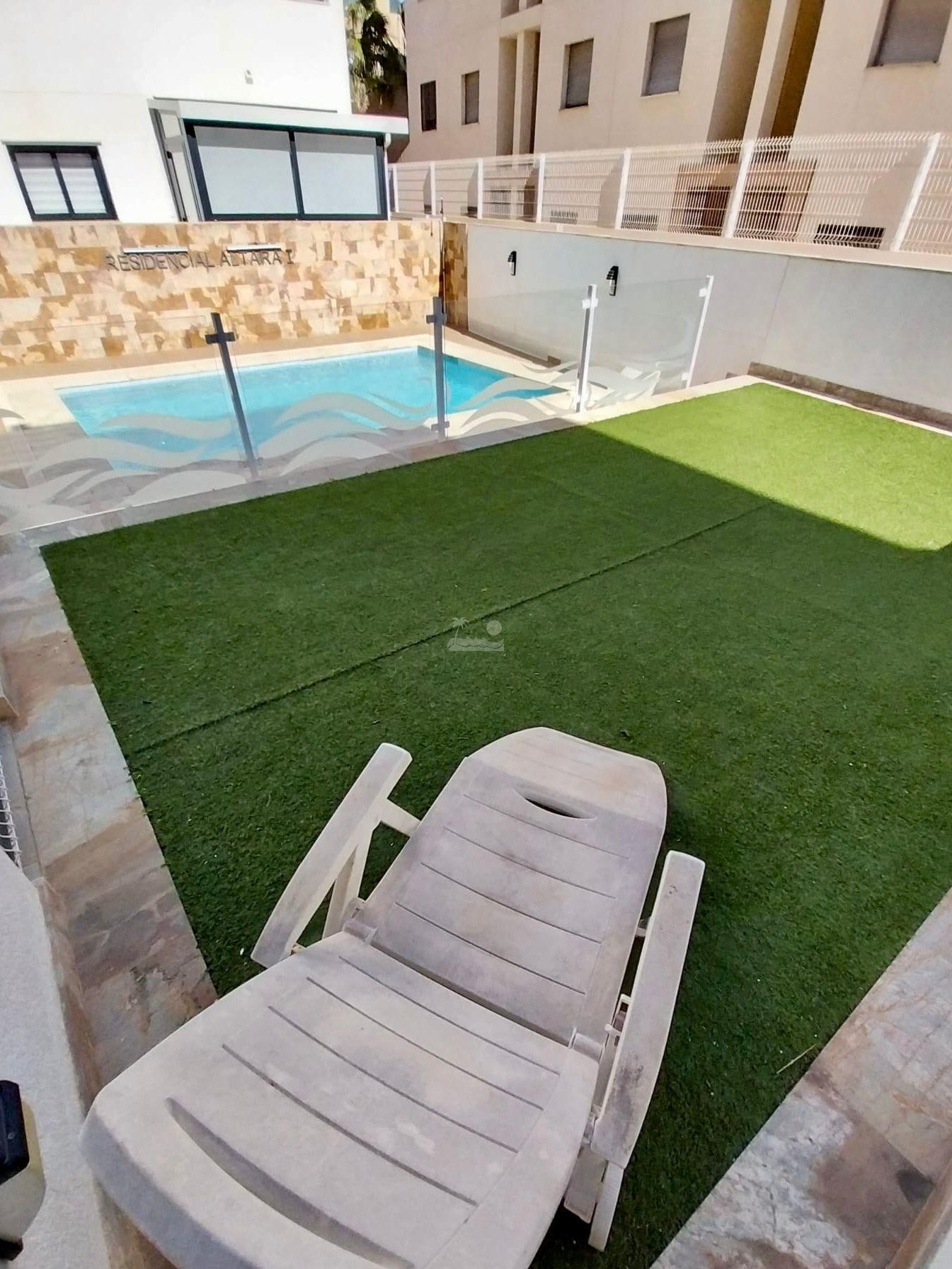 El residencial en moderno y cuenta con piscina comunitaria y zonas de relax.