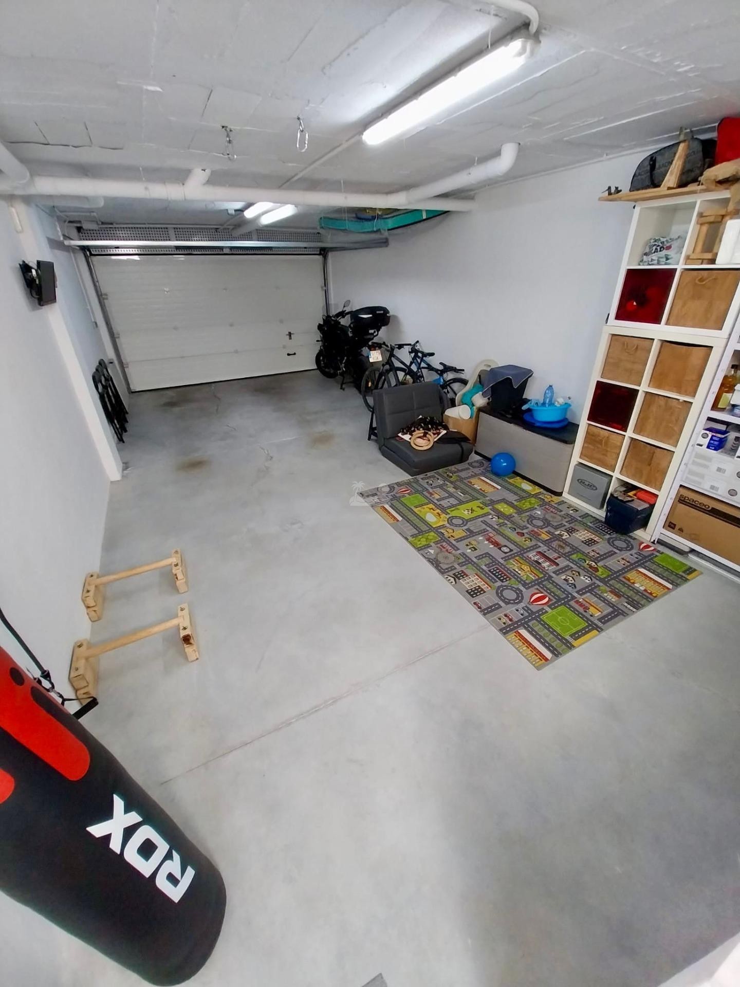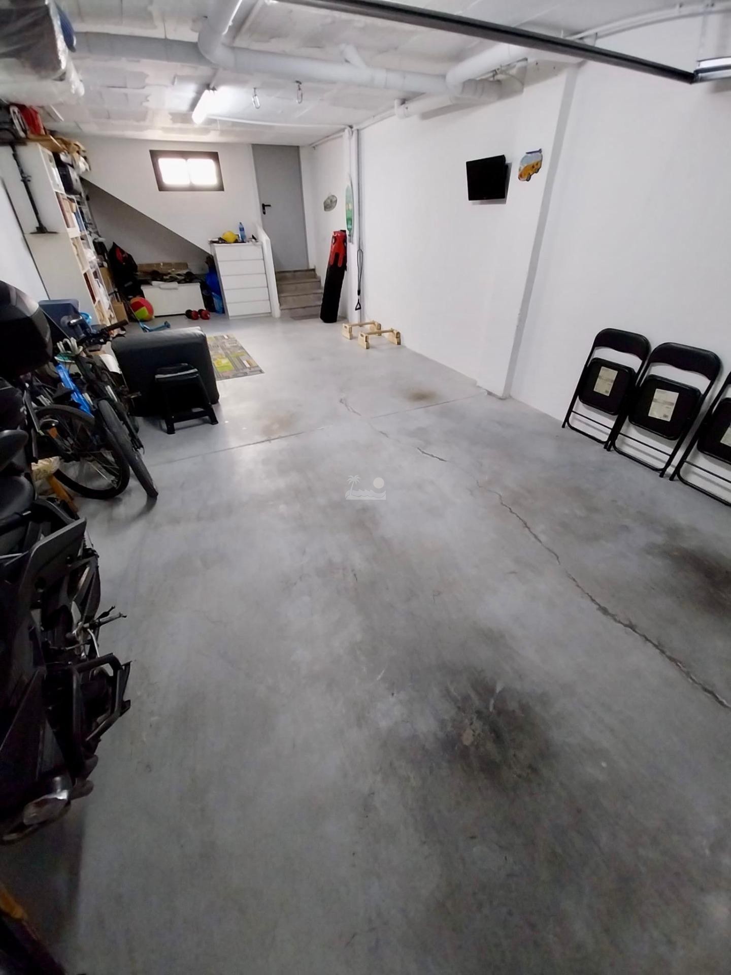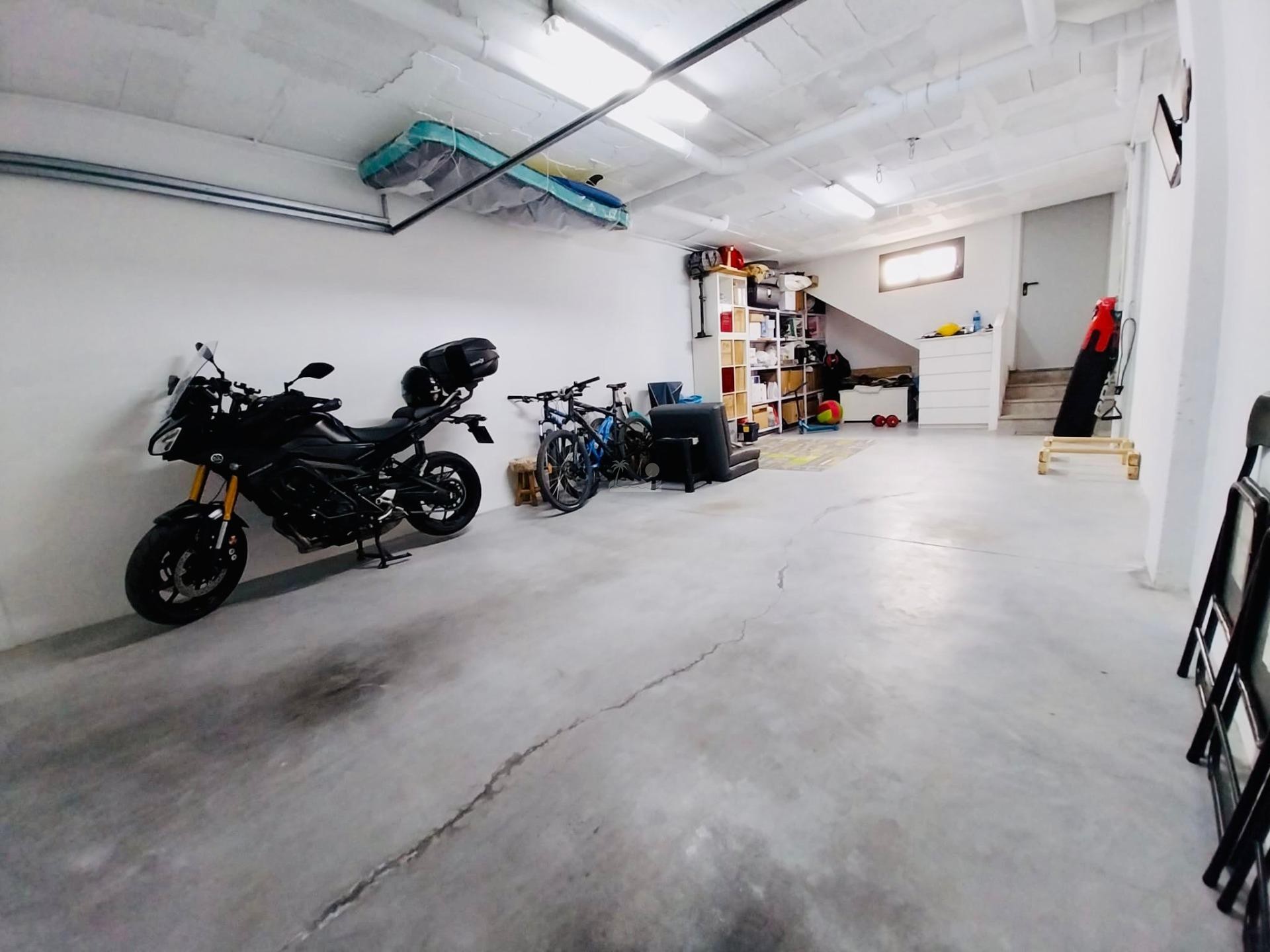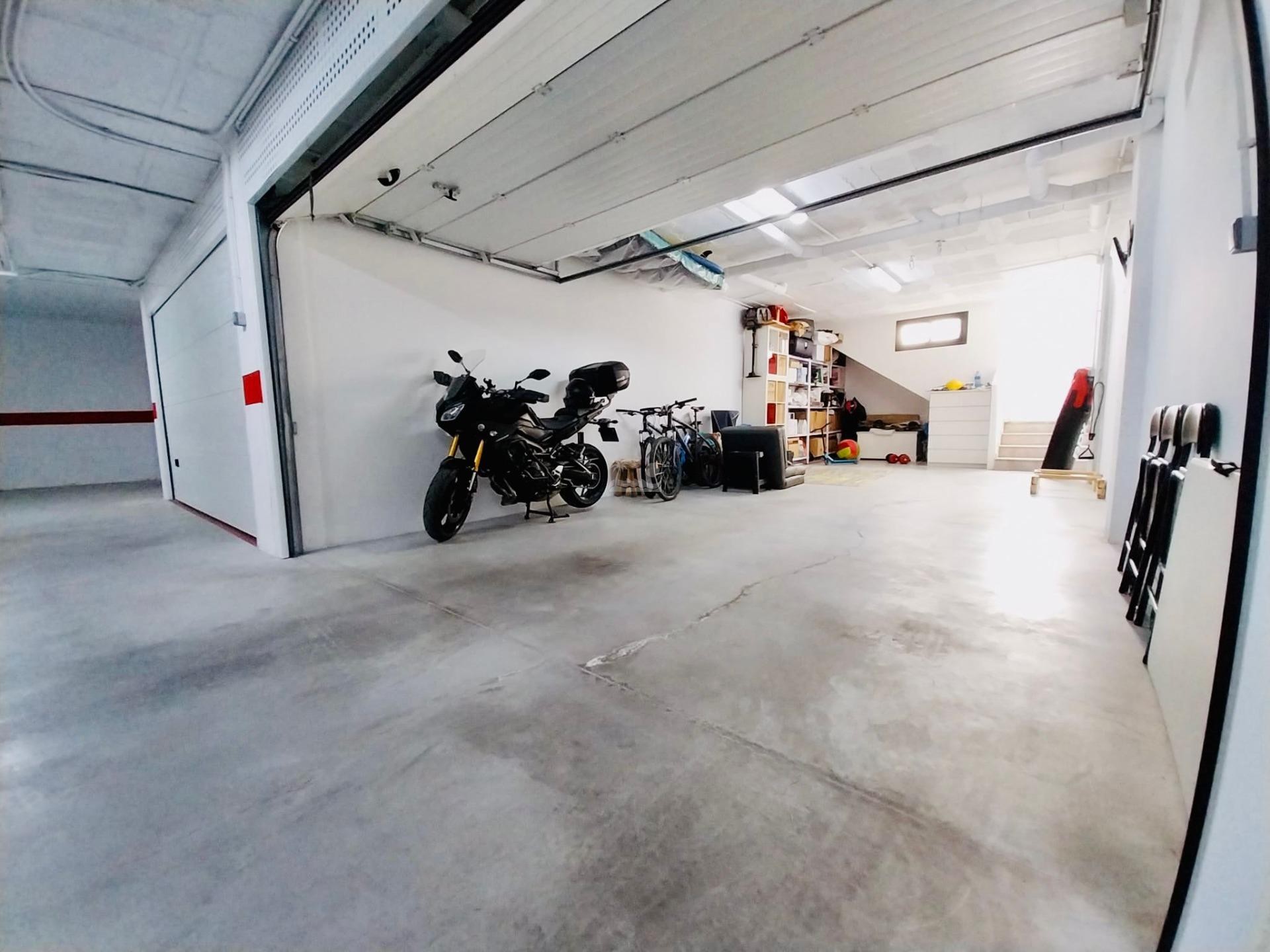 El sótano cuenta con una enorme cochera con capacidad para dos vehículos o para coche y trastero o sala auxiliar tipo gimnasio o sala de juegos.